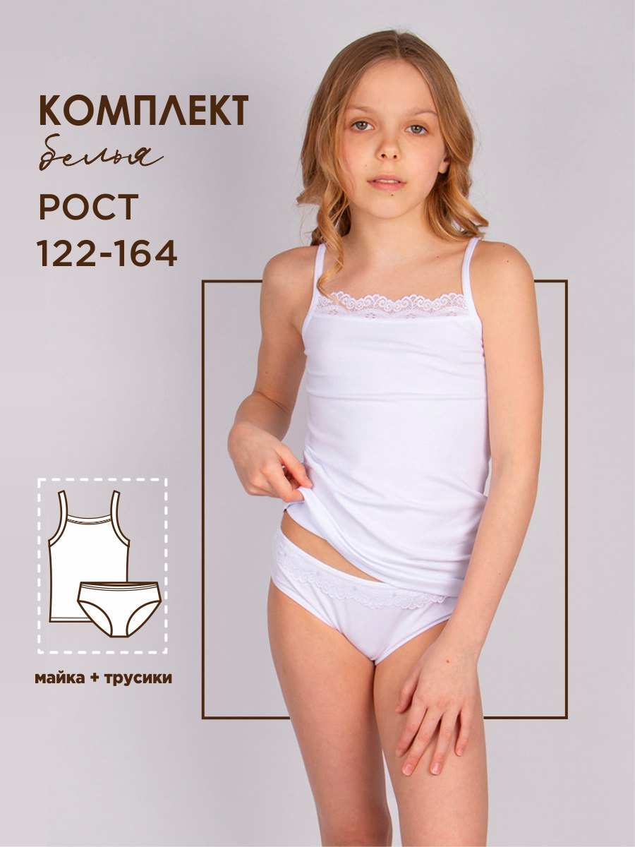 Ажурный комплект нижнего белья (майка и трусы) для девочек. Натуральный материал, не вызывает аллергии и раздражения кожи. Обладает высокими гигроскопичными и воздухопроницаемыми свойствами. В таком комплекте ребенок будет чувствовать себя легко и комфортно на протяжении всего дня. Размер 122-128/7-8 (рост 122-128 см) Размер 134-140/9-10 (рост 134-140 см) Размер 146-152/11-12 (рост 146-152 см) Размер 158-164/13-14 (рост 158-164 см)
