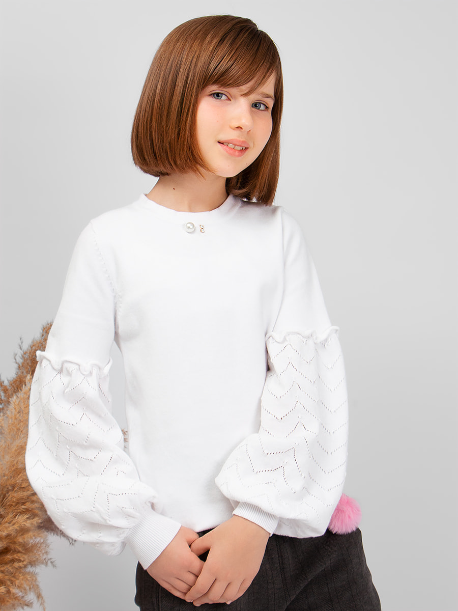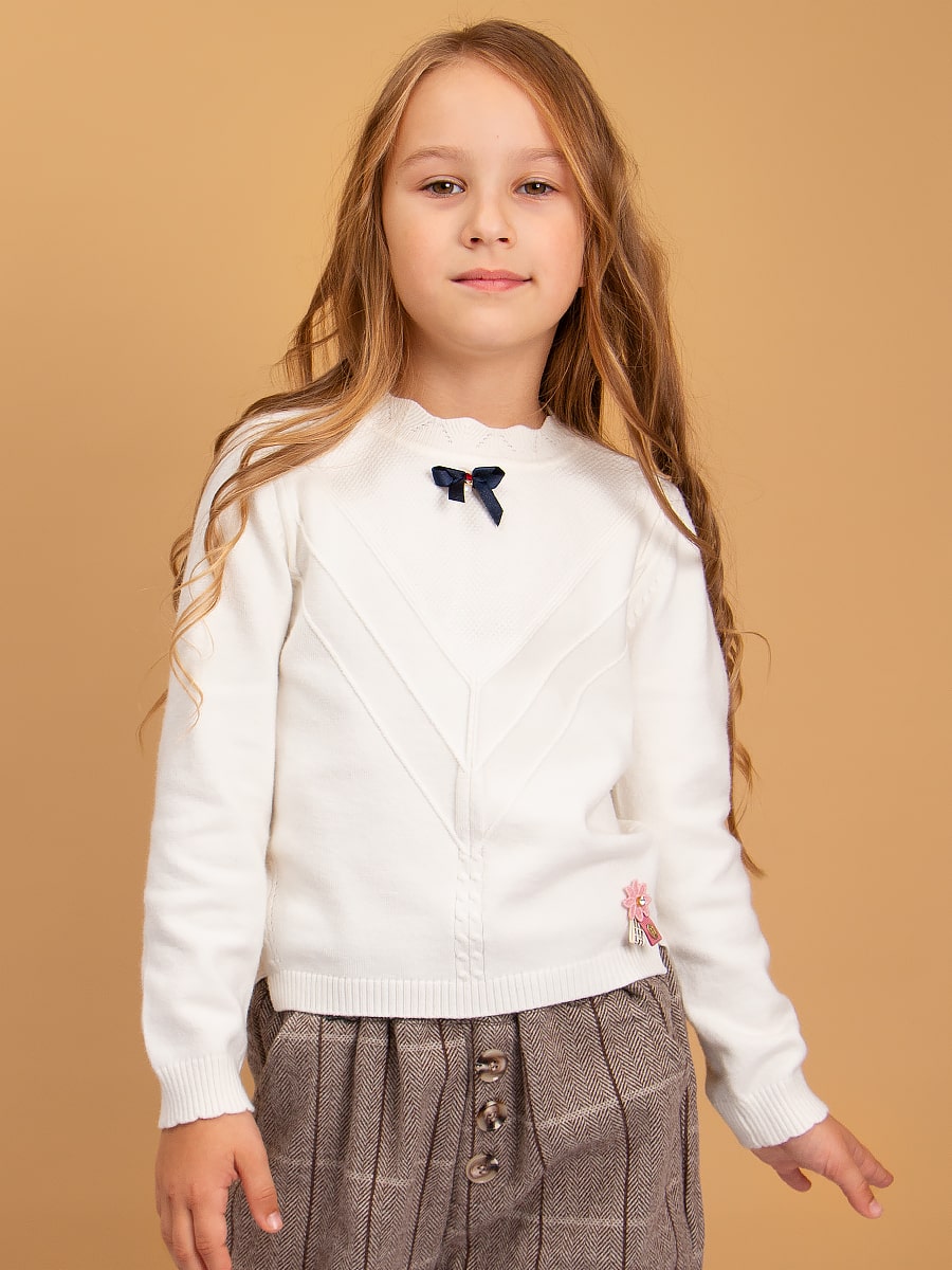 Элегантный джемпер для девочки, декорированный съёмной брошью. Мягкий, вязаный трикотаж не сковывает движений, обладает хорошей воздухопроницаемостью и приятно облегает тело. Джемпер прекрасно сочетается как с юбками, так и с брюками. Подойдет для посещения школы, официального или праздничного мероприятия. Размер 128 (рост 122-128 см) длина изделия 44 см, обхват груди 60 см, длина рукава 46 см. Размер 134 (рост 128-134 см) длина изделия 46 см, обхват груди 64 см, длина рукава 48 см. Размер 140 (рост 134-140 см) длина изделия 50 см, обхват груди 70 см, длина рукава 52 см. Размер 146 (рост 140-146 см) длина изделия 52 см, обхват груди 72 см, длина рукава 54 см. Размер 152 (рост 146-152 см) длина изделия 56 см, обхват груди 74 см, длина рукава 58 см.