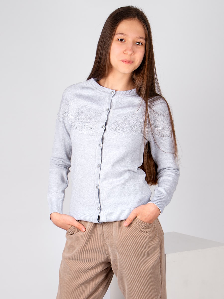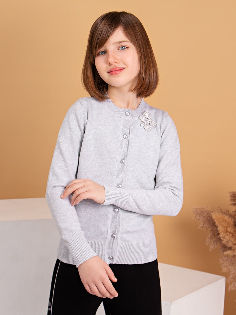 Элегантный кардиган на пуговицах, декорированный стразами. Особый шарм модели придает оригинальная съемная брошь. Мягкий, вязаный трикотаж не сковывает движений, обладает хорошей воздухопроницаемостью и приятно облегает тело. Кардиган прекрасно сочетается как с юбками, так и с брюками. Подойдет для посещения школы, официального или праздничного мероприятия. Размер 122-128 (рост 122-128 см) длина изделия 48 см, обхват груди 70 см, длина рукава 49 см. Размер 128-134 (рост 128-134 см) длина изделия 51 см, обхват груди 72 см, длина рукава 52 см. Размер 140-146 (рост 140-146 см) длина изделия 55 см, обхват груди 78 см, длина рукава 57 см. Размер 152-158 (рост 152-158 см) длина изделия 58 см, обхват груди 82 см, длина рукава 59 см. Размер 164-170 (рост 164-170 см) длина изделия 60 см, обхват груди 86 см, длина рукава 61 см.