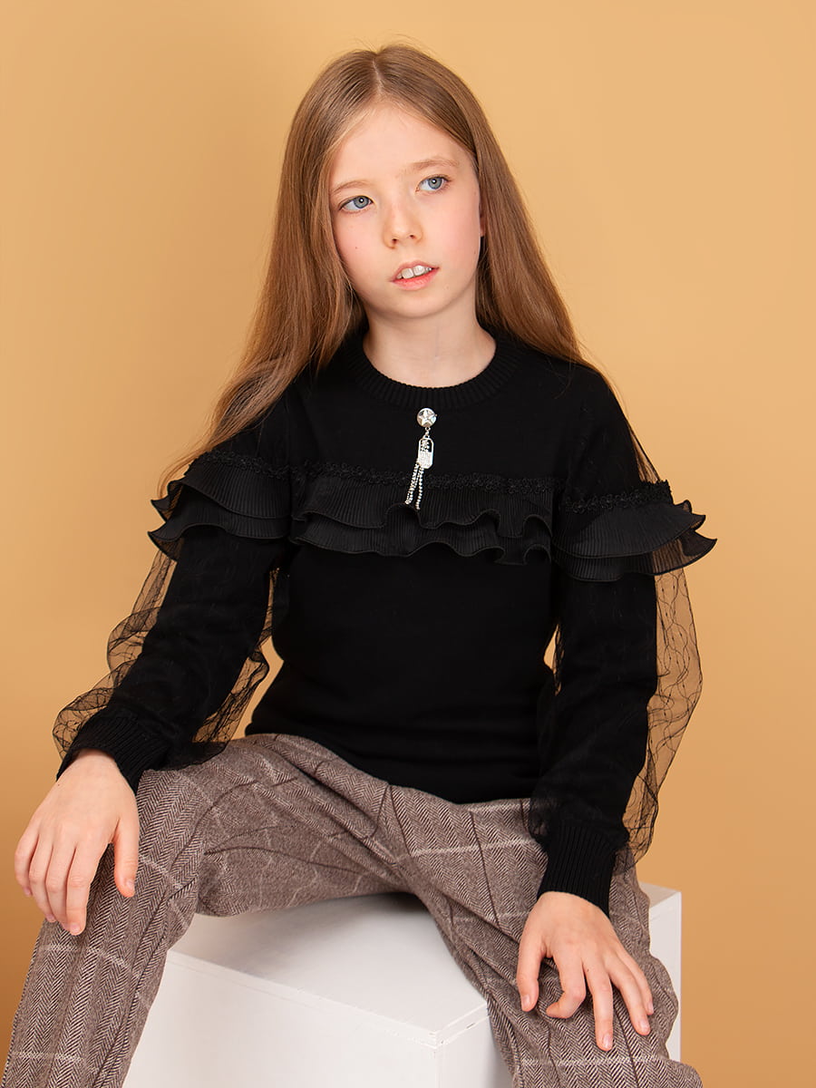 Элегантный джемпер для девочки, декорированный плиссированной рюшей. Рукава украшены воздушным фатином, модель дополнена брошью. Мягкий, вязаный трикотаж не сковывает движений, обладает хорошей воздухопроницаемостью и приятно облегает тело. Джемпер прекрасно сочетается как с юбками, так и с брюками. Подойдет для посещения школы, официального или праздничного мероприятия. Размер 128 (рост 122-128 см) длина изделия 44 см, обхват груди 60 см, длина рукава 44 см. Размер 134 (рост 128-134 см) длина изделия 46 см, обхват груди 64 см, длина рукава 48 см. Размер 140 (рост 134-140 см) длина изделия 50 см, обхват груди 70 см, длина рукава 50 см. Размер 146 (рост 140-146 см) длина изделия 52 см, обхват груди 72 см, длина рукава 54 см. Размер 152 (рост 146-152 см) длина изделия 56 см, обхват груди 74 см, длина рукава 56 см.