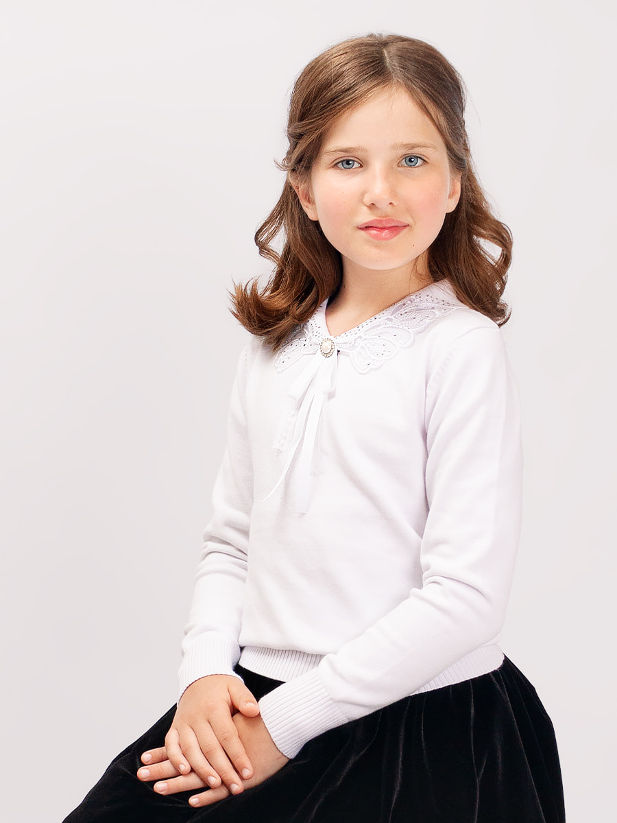 Элегантный джемпер для девочки, декорированный съёмной брошью. Особый шарм модели придает кружевной воротник. Мягкий, вязаный трикотаж не сковывает движений, обладает хорошей воздухопроницаемостью и приятно облегает тело. Джемпер прекрасно сочетается как с юбками, так и с брюками. Подойдет для посещения школы, официального или праздничного мероприятия. Размер 128-9 (рост 122-128 см) длина изделия 44 см, обхват груди 60 см, длина рукава 46 см. Размер 134-11 (рост 128-134 см) длина изделия 46 см, обхват груди 64 см, длина рукава 48 см. Размер 140-13 (рост 134-140 см) длина изделия 50 см, обхват груди 70 см, длина рукава 52 см. Размер 146-15 (рост 140-146 см) длина изделия 52 см, обхват груди 72 см, длина рукава 54 см. Размер 152-17 (рост 146-152 см) длина изделия 56 см, обхват груди 74 см, длина рукава 58 см.