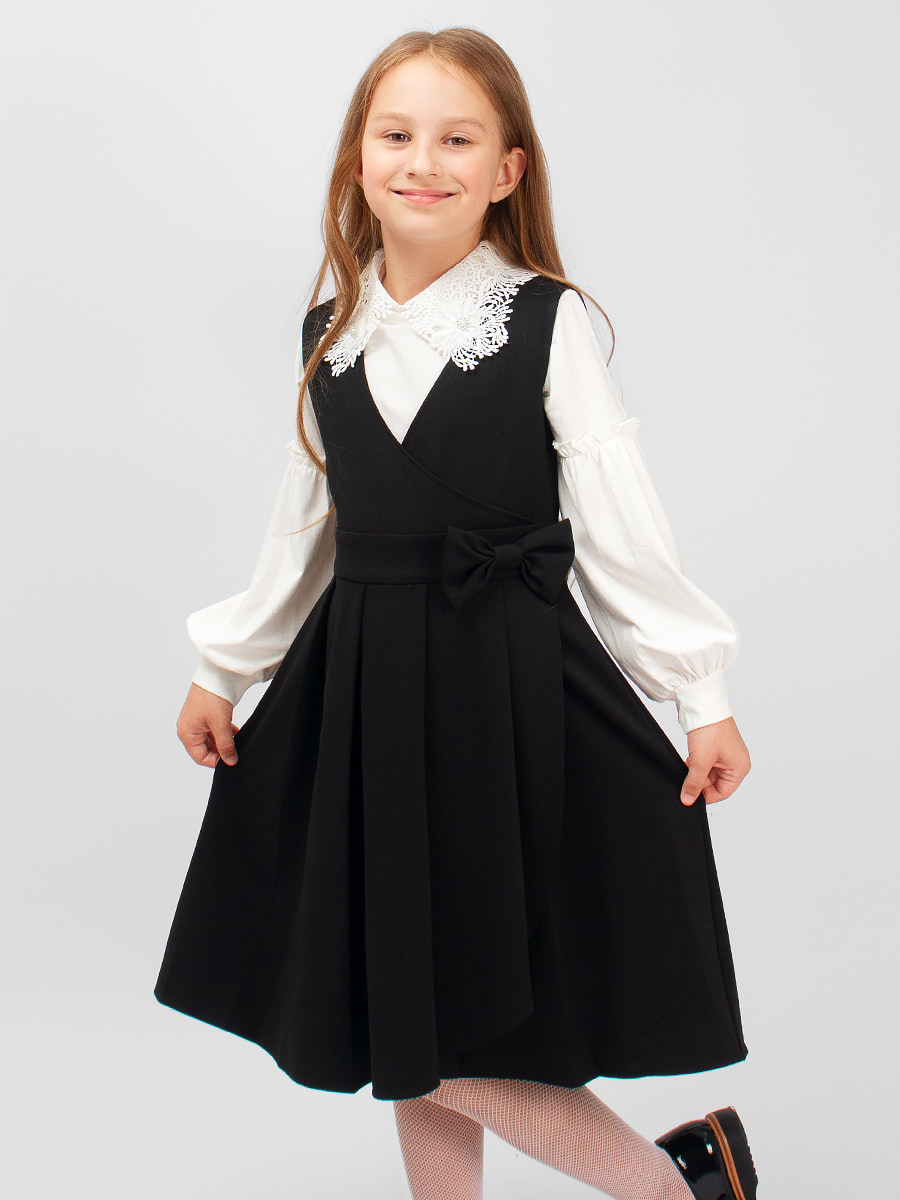 Сарафан с круглым вырезом, прямого силуэта. Передняя полочка декорирована цветочным кружевом. Модель с плиссированной вставкой на юбке. Идеальный выбор для создания элегантного школьного образа. Размер 128 (рост 122-128 см) длина изделия 65 см, обхват груди 64 см. Размер 134 (рост 128-134 см) длина изделия 68 см, обхват груди 68 см. Размер 140 (рост 134-140 см) длина изделия 72 см, обхват груди 74 см. Размер 146 (рост 140-146 см) длина изделия 74 см, обхват груди 80 см. Размер 152 (рост 146-152 см) длина изделия 78 см, обхват груди 84 см.
