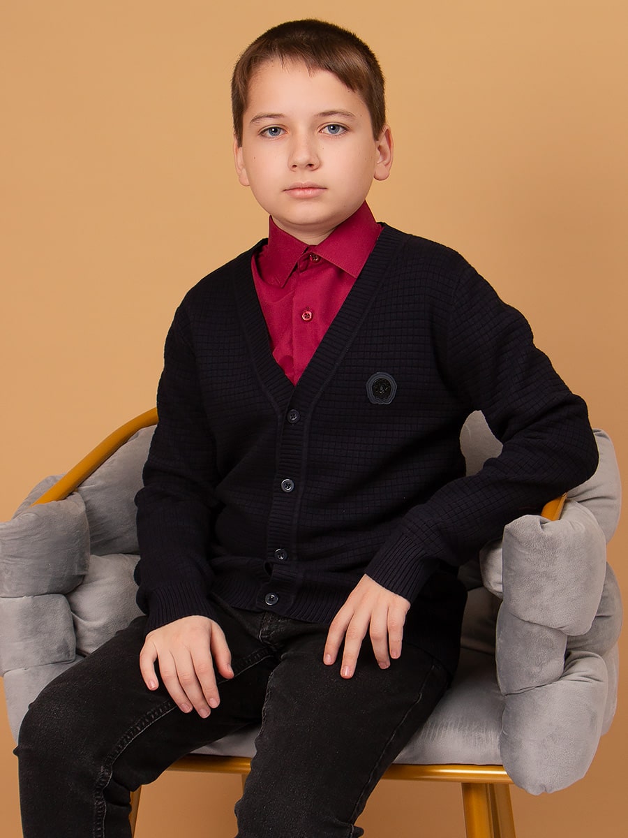 Стильный, трикотажный кардиган на пуговицах для мальчика. Мягкий, вязаный трикотаж не сковывает движений, обладает хорошей воздухопроницаемостью и приятно облегает тело. Прекрасно вольется как в повседневный, так и в школьный гардероб. Размер 128 (рост 122-128 см) длина изделия 46 см, обхват груди 70 см, длина рукава 44 см. Размер 134 (рост 128-134 см) длина изделия 48 см, обхват груди 72 см, длина рукава 46 см. Размер 140 (рост 134-140 см) длина изделия 52 см, обхват груди 76 см, длина рукава 50 см. Размер 146 (рост 140-146 см) длина изделия 54 см, обхват груди 78 см, длина рукава 54 см. Размер 152 (рост 146-152 см) длина изделия 56 см, обхват груди 82 см, длина рукава 56 см.
