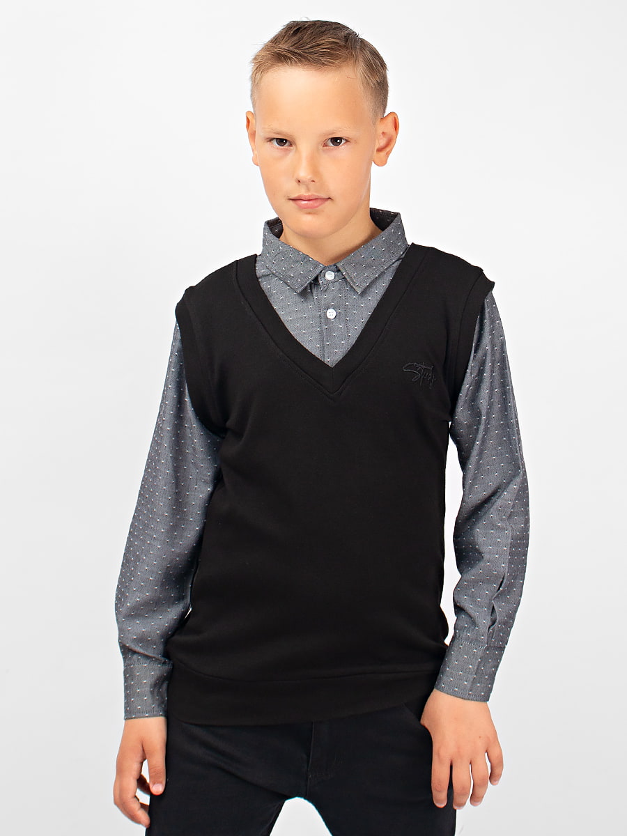 Джемпер-обманка с имитацией рубашки. Жилет с V-образным вырезом, выполнен из мягкого, приятного к телу трикотажа. По низу изделия - манжет. Имитация рубашки так же выполнена из натурального материала, на груди застегивается на две пуговицы. Идеальный выбор для создания классического школьного образа. Размер 140 (рост 134-140 см) длина изделия 56 см, обхват груди 78 см, длина рукава 48 см. Размер 146 (рост 140-146 см) длина изделия 56 см, обхват груди 80 см, длина рукава 50 см. Размер 152 (рост 146-152 см) длина изделия 58 см, обхват груди 82 см, длина рукава 52 см. Размер 158 (рост 152-158 см) длина изделия 60 см, обхват груди 84 см, длина рукава 53 см.