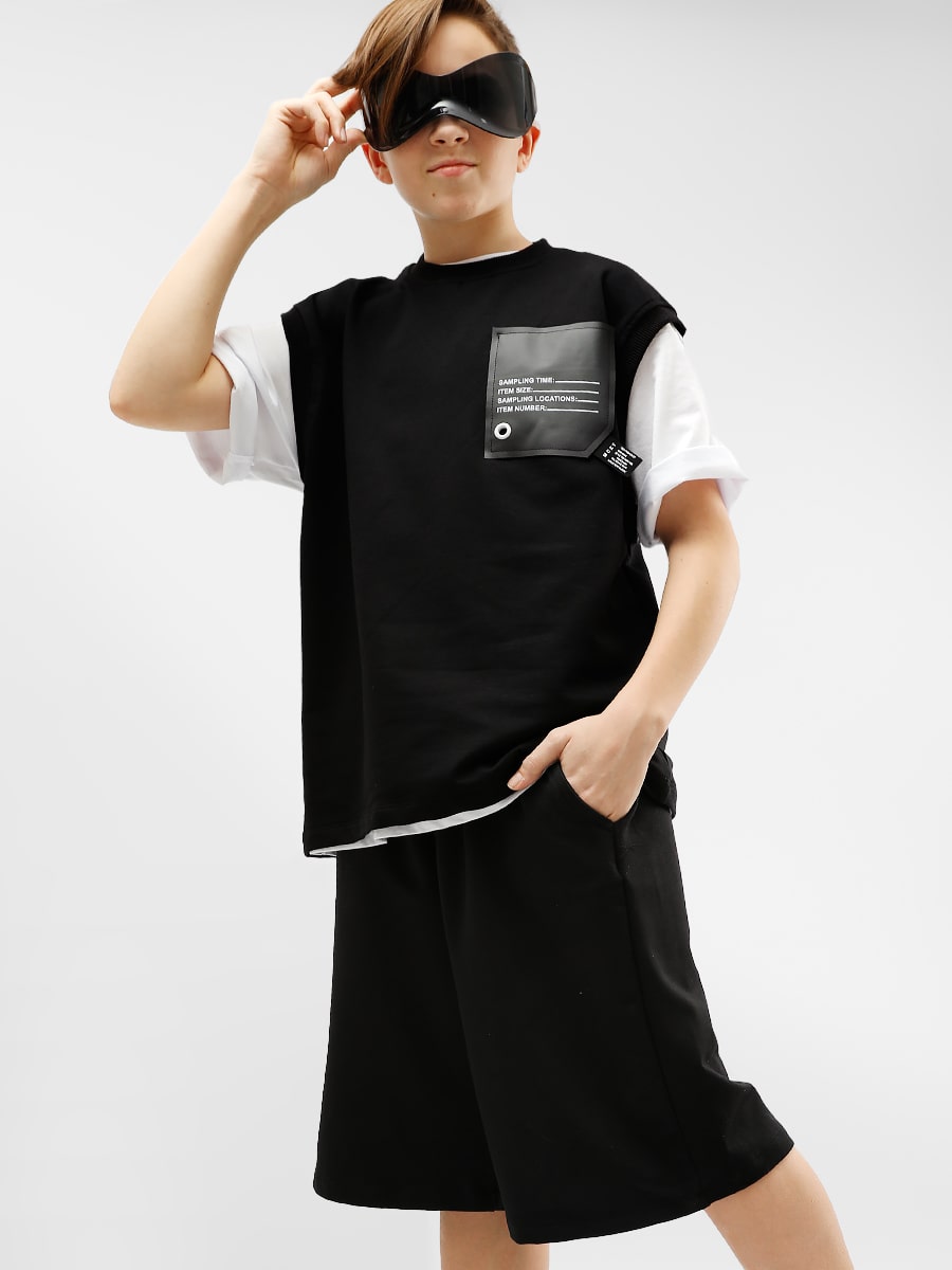 Костюм для мальчика Соль&Перец. Футболка свободного кроя, с принтом. Шорты по талии на мягкой, широкой резинке, с карманами. Футболка и шорты со светоотражающими элементами. Плотный и эластичный трикотаж футер 2-х нитка хорошо пропускает воздух, не теряет формы. Размер 140 (рост 134-140 см) длина футболки 58 см, обхват груди 98 см; длина шорт 48 см, ОТ 60 см, ОБ 90 см. Размер 146 (рост 140-146 см) длина футболки 60 см, обхват груди 100 см; длина шорт 50 см, ОТ 62 см, ОБ 94 см. Размер 152 (рост 146-152 см) длина футболки 62 см, обхват груди 104 см; длина шорт 52 см, ОТ 64 см, ОБ 98 см. Размер 158 (рост 152-158 см) длина футболки 64 см, обхват груди 108 см; длина шорт 52 см, ОТ 66 см, ОБ 102 см. Размер 164 (рост 158-164 см) длина футболки 66 см, обхват груди 110 см; длина шорт 54 см, ОТ 68 см, ОБ 104 см.