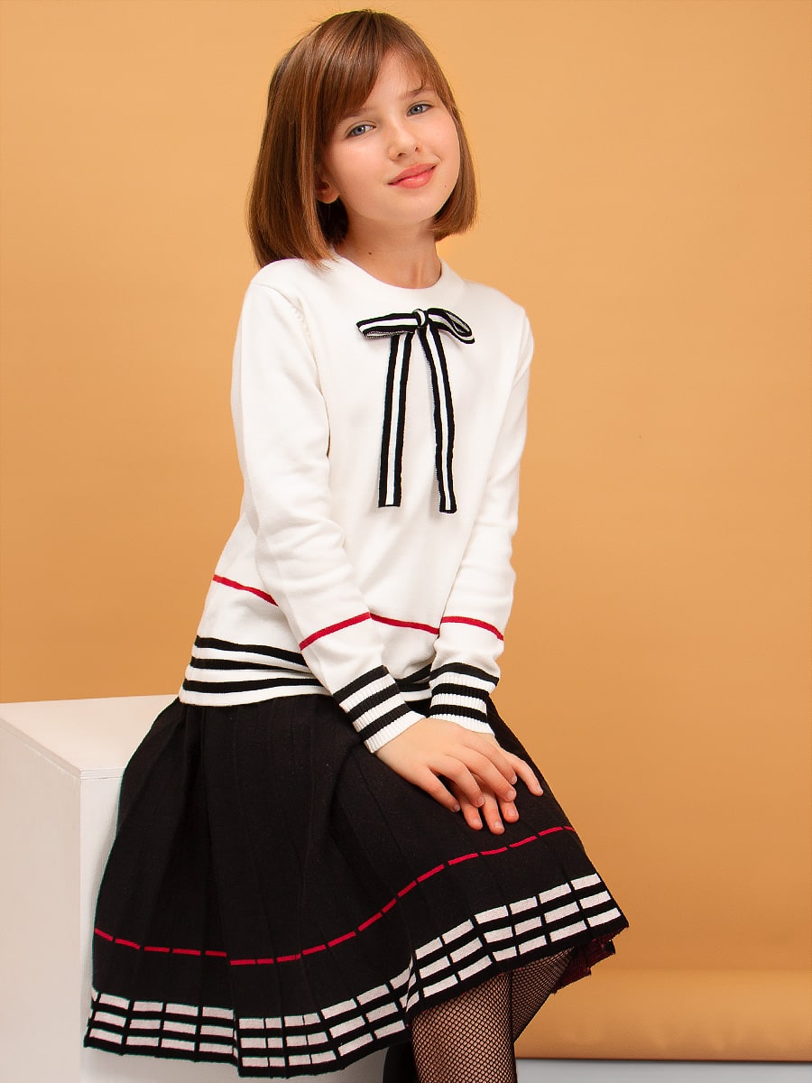 Тёплый костюм для девочки. Кофта и юбка выполнены из трикотажа плотной вязки, декорированы трендовым рисунком. Кофта дополнена съёмной брошью. Стильный образ для посещения школы, официального или праздничного мероприятия. Размер 9/120-128 (рост 122-128 см) длина кофты 44 см, обхват груди 68 см, длина рукава 42 см, длина юбки 48 см, обхват талии 50 см. Размер 11/130-134 (рост 128-134 см) длина кофты 48 см, обхват груди 70 см, длина рукава 46 см, длина юбки 50 см, обхват талии 56 см. Размер 13/140-140 (рост 134-140 см) длина кофты 50 см, обхват груди 72 см, длина рукава 48 см, длина юбки 52 см, обхват талии 58 см. Размер 15/150-146 (рост 140-146 см) длина кофты 52 см, обхват груди 76 см, длина рукава 50 см, длина юбки 54 см, обхват талии 60 см. Размер 17/160-152 (рост 146-152 см) длина кофты 56 см, обхват груди 80 см, длина рукава 52 см, длина юбки 56 см, обхват талии 62 см.